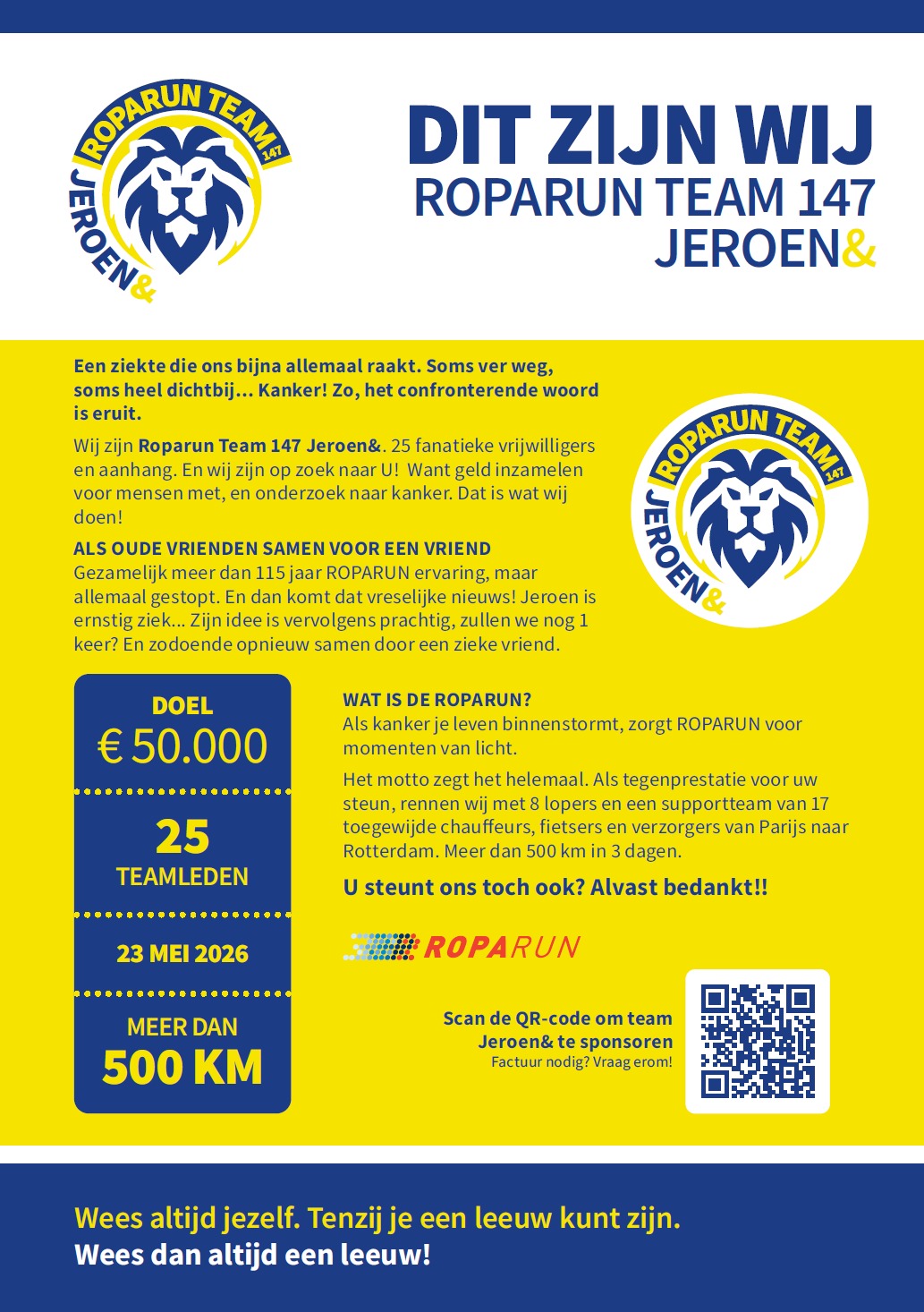 De gehele dag zal in het teken staan van de Roparun. Dit is een estafetteloop vanuit Parijs naar Rotterdam om geld in zamelen om het leven voor mensen met kanker dragelijker te maken.” Leven toevoegen aan de dagen, daar waar vaak geen dagen meer toegevoegd kunnen worden aan het leven” is het motto van de Roparun-stichting. Ook wordt dit geld besteed aan onderzoek en behandelingen. In het bijzonder vragen we aandacht voor Team147 Jeroen&, waar veel van onze vrijwilligers betrokken bij zijn. Kijk voor meer informatie over dit bijzondere project en/of een mogelijk donatie, op onderstaande link.